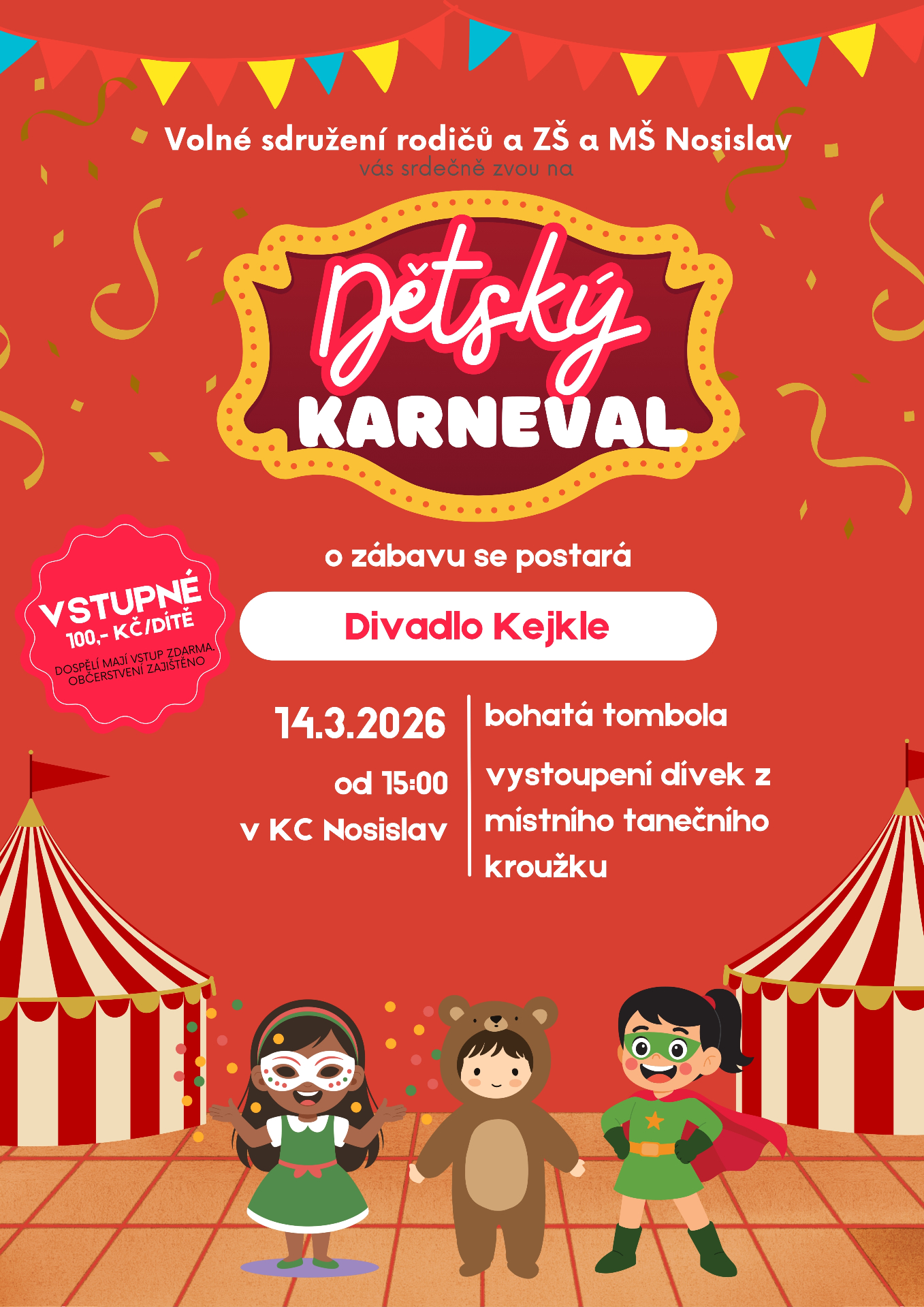 Srdečně zveme všechny malé i veliké na letošní dětský karneval v Nosislavi! Letos se můžete těšit na bohatou tombolu, vystoupení děvčat z místního tanečního kroužku a o skvělou náladu a atmosféru se postará Divadlo Kejkle - čeká nás Cirkusový Karneval. Děti, vezměte s sebou rodiče i prarodiče. Občerstvení bude zajištěno. Těšíme se na Vás 14.3. v 15:00 v KC v Nosislavi.